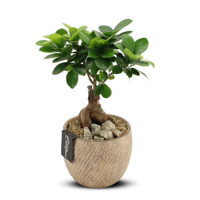 Ficus Ginseng är en charmig inomhusväxt med tjocka, skulpturala rötter som påminner om bonsaiträd och små glänsande blad som bildar en kompakt krona. Den trivs bäst i ljusa lägen utan direkt sol och behöver endast vattnas när jorden känns torr, vilket gör den perfekt för nybörjare som vill ha en dekorativ och lättskött krukväxt. Med sin eleganta beige kruka passar den utmärkt som prydnad i hem, kontor eller på balkong och tål även mindre glömska när det gäller vattning.