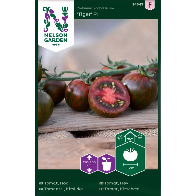 Tiger är en dekorativ körsbärstomat med karakteristiska gul-röda randiga frukter som har en söt, aromatisk smak och blir cirka 3-4 cm stora. Växten blir medelhög och trivs utmärkt både i växthus och på solig balkong, och är tacksam att odla även för nybörjaren. Så fröna inomhus i mars-april och plantera ut efter sista frost för en riklig skörd från juli till oktober.
