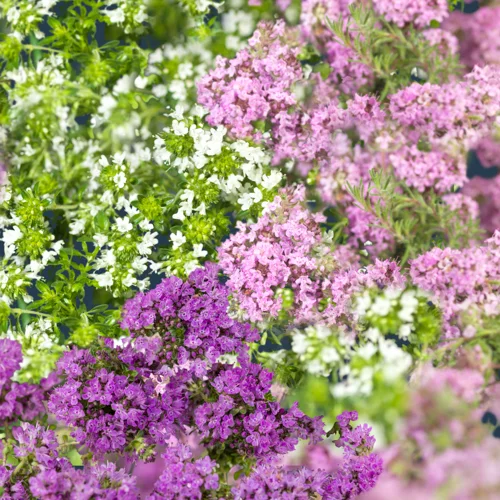 Krypande timjan är en aromatisk, flerårig krydda som bildar täta mattor av små, grågrönagröna blad och blommar med små lila eller vita blommor under sommaren. Den trivs bäst i soliga lägen med genomsläpplig jord och är perfekt som marktäckare mellan stenplattor, i rockarrier eller som kantväxt, samtidigt som bladen kan skördas för matlagning året runt. Denna lättodlade och tåliga växt passar utmärkt för nybörjare och trivs lika bra i kruka på balkongen som utomhus i trädgården.