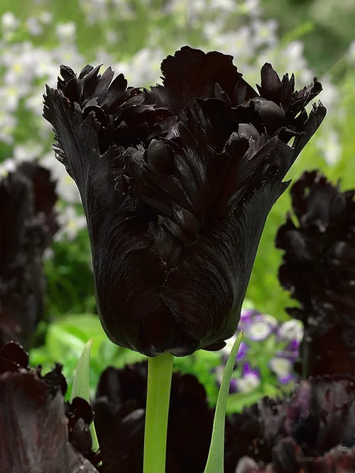 Papegojtulpan Black Parrot är en dramatisk tulpansort med djupt mörklila, nästan svarta blommor som har fransiga, vågiga kronblad som påminner om papegojfjädrar. Plantera lökarna på hösten 10-15 cm djupt i väldrainerad jord på en solig till halvskuggig plats, så blommar de vackert i maj. Denna spektakulära sort passar perfekt för både nybörjare och erfarna odlare, och trivs lika bra i rabatten som i krukor på balkongen där den skapar en striking färgklick.