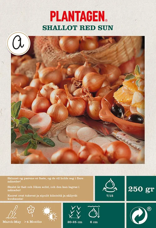 Red Sun är en rödskalsig schalottenlök med mild, söt smak som är perfekt för matlagning och passar utmärkt både färsk och konserverad. Plantera löken på våren i väldrän jord på solig plats, och skörda när blasten gulnar på sensommaren - en lök ger ofta 6-8 nya lökar. Schalottenlök är lättodlad och passar både nybörjare och erfarna odlare, och trivs lika bra i trädgårdsland som i större krukor på balkongen.