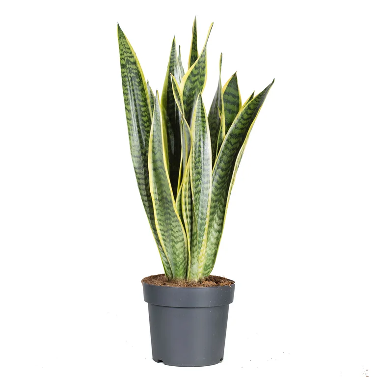 Svärmors tunga 'Laurentii' är en robust krukväxt med långa, upprätta blad i mörkgrönt med gula kanter som skapar en elegant, arkitektonisk känsla i hemmet. Den trivs bäst i ljus plats utan direkt solljus och behöver bara vattnas när jorden torkat upp, vilket gör den perfekt för nybörjare eller den som ofta reser bort. Denna tåliga växt fungerar utmärkt som solitär i vardagsrummet eller som del av en växtgrupp, och den renar dessutom luften vilket är en fin bonus.