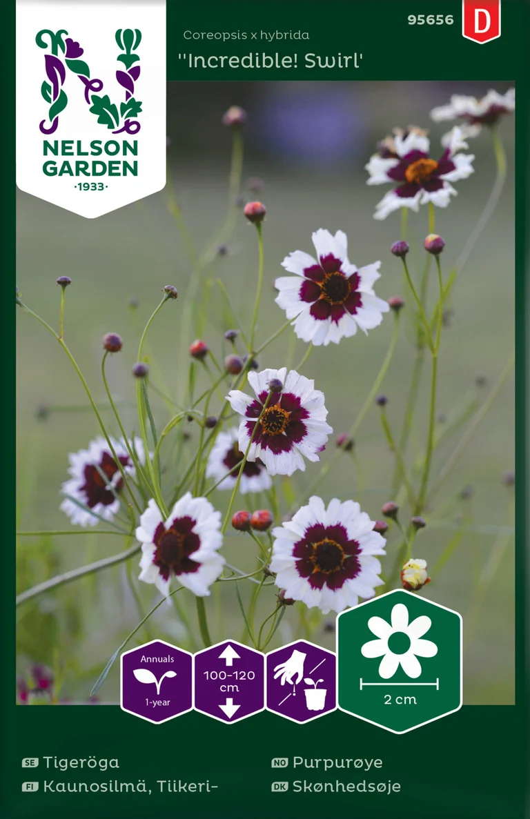 Tigeröga Incredible! Swirl är en härlig ettårig sommarblomma med stora, tvåfärgade blommor i gult och rött som blommar hela sommaren fram till frost. Fröna sås direkt i rabatt eller kruka på våren när frostrisken är över, och trivs bäst i soligt läge med genomsläpplig jord. Perfekt för nybörjare då den är lättodlad och tålig, och passar utmärkt både i trädgårdsrabatter och som färgklick i balkongkrukor.