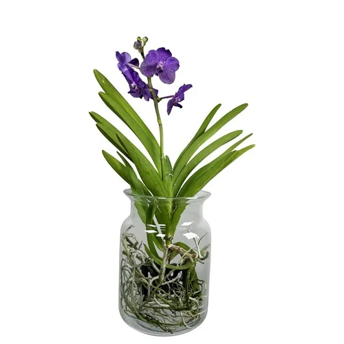 Vanda är en exotisk orkidé med spektakulära, färgglada blommor som levereras i en elegant glaskruka som visar upp plantans unika luftrötter. Denna tropiska skönhet trivs bäst i ljust läge utan direkt sol och behöver regelbunden vattning genom att doppas i ljummet vatten ett par gånger i veckan. Perfekt för orkidéentusiasten som vill ha något extra speciellt på fönsterbrädan eller som en iögonfallande present till någon som älskar ovanliga växter.